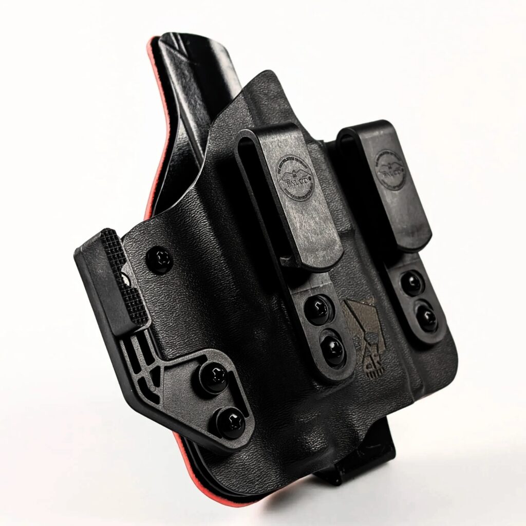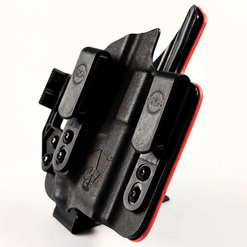 For appendix carry users, the holsters include an integrated concealment claw that angles the handgun’s grip snugly toward the body for improved concealment. Two retention screws allow for precise adjustment of draw resistance. “A claw angles the handgun’s grip snugly toward the body, ensuring perfect concealment during appendix carry,” FALCO explains. The holsters come equipped with slim polymer belt clips that secure firmly to belts without adding bulk and allow a tucked-in shirt for additional concealment.