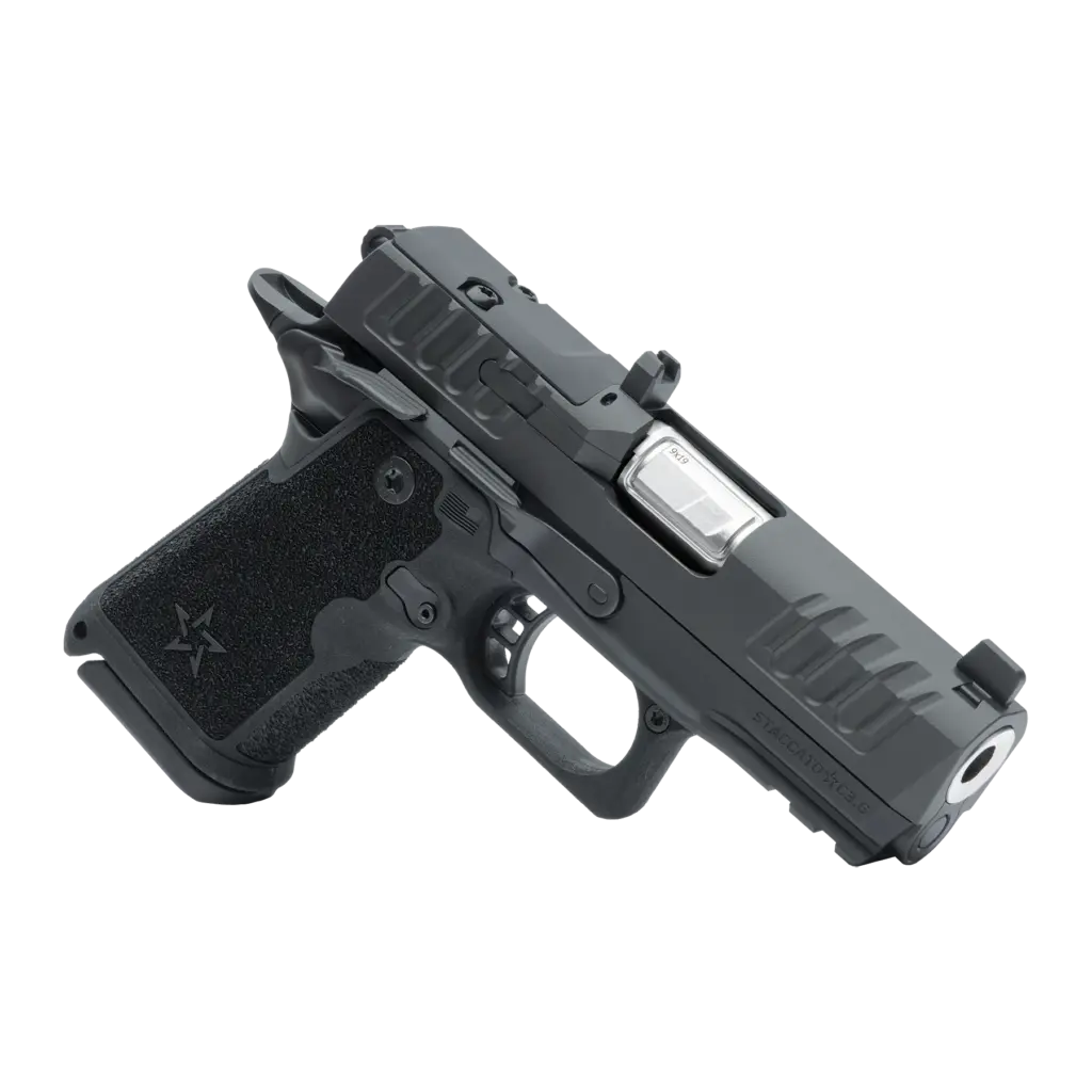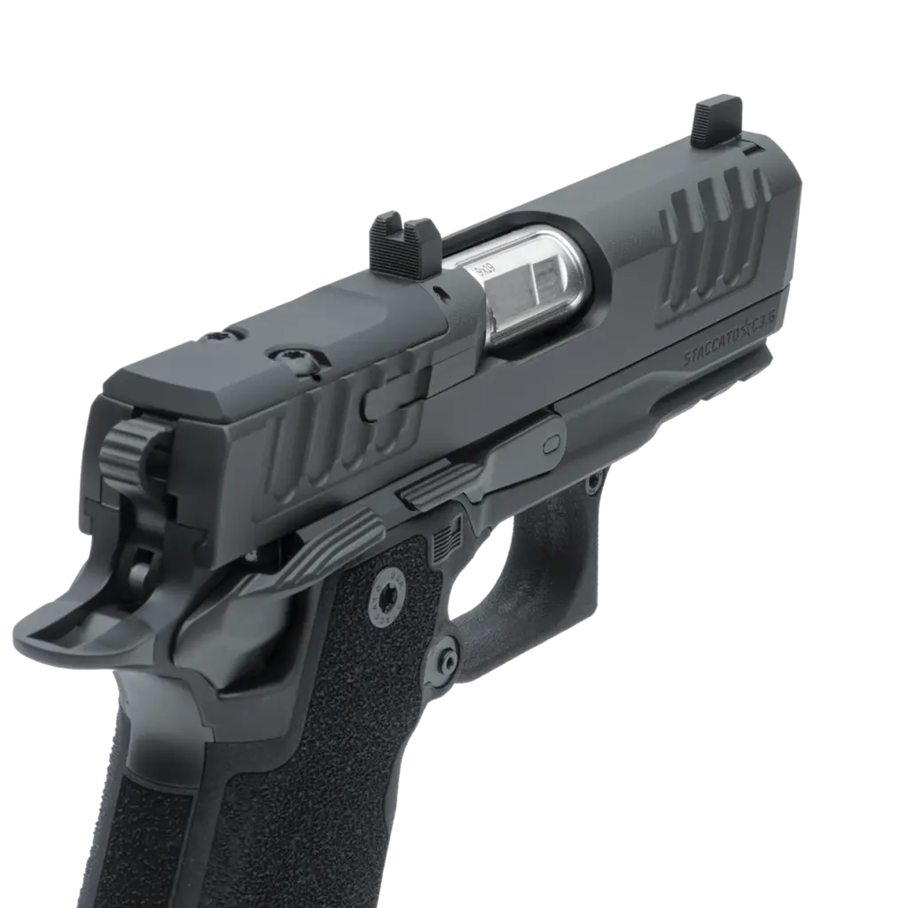 • Optic readiness: Staccato’s HOST mounting system (uses spacer plates and longer optic screws for secure attachment).
