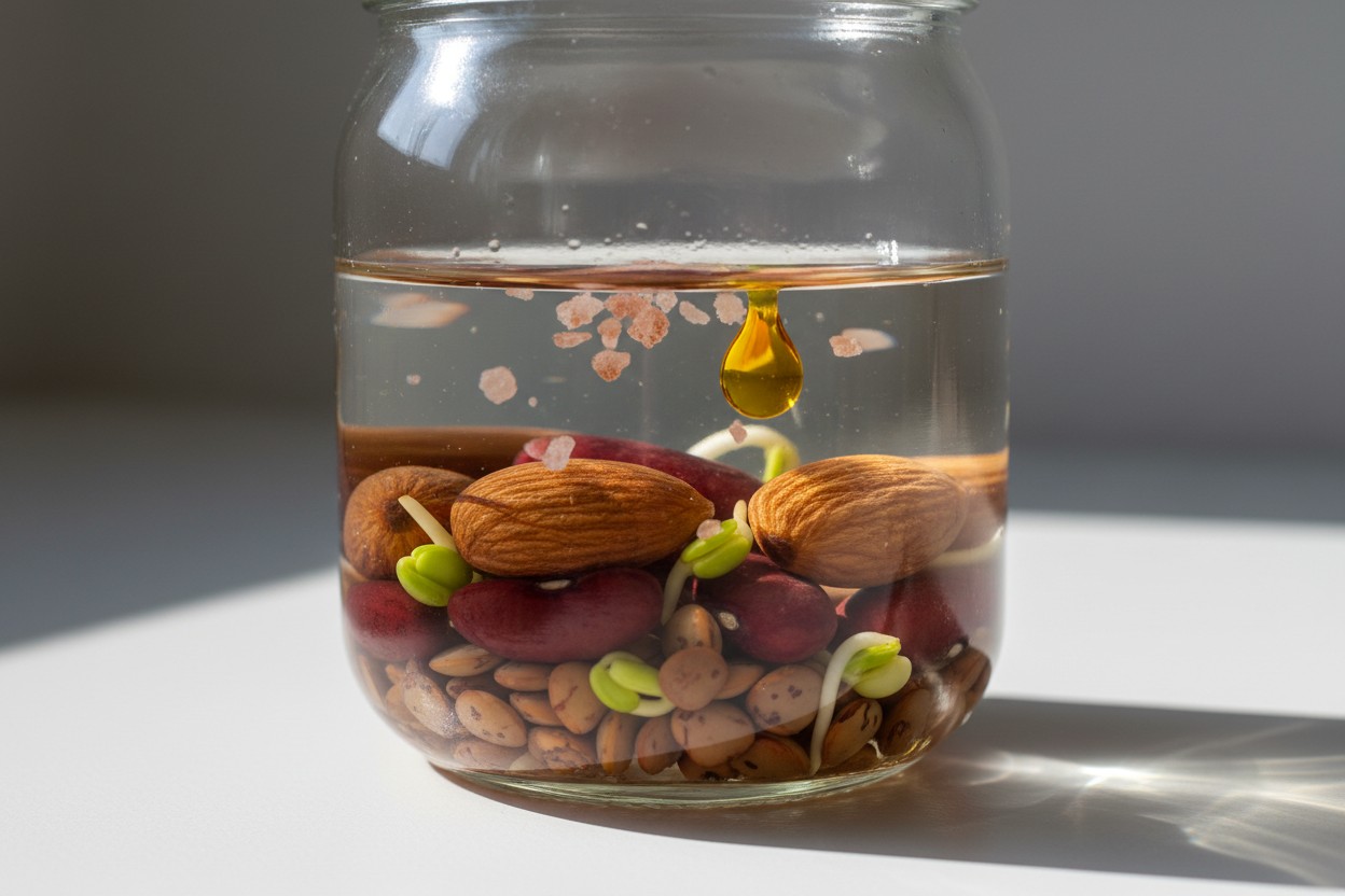 For every cup of nuts or seeds, the method recommends adding one teaspoon of mineral-rich salt, like Celtic Sea Salt, to the soaking water [2]. For legumes, an acidic medium such as apple cider vinegar or kombu is suggested [3]. The process is described as part of an ongoing series on food preparation that has previously covered growing sprouts and microgreens, as well as sprouting grains [1].