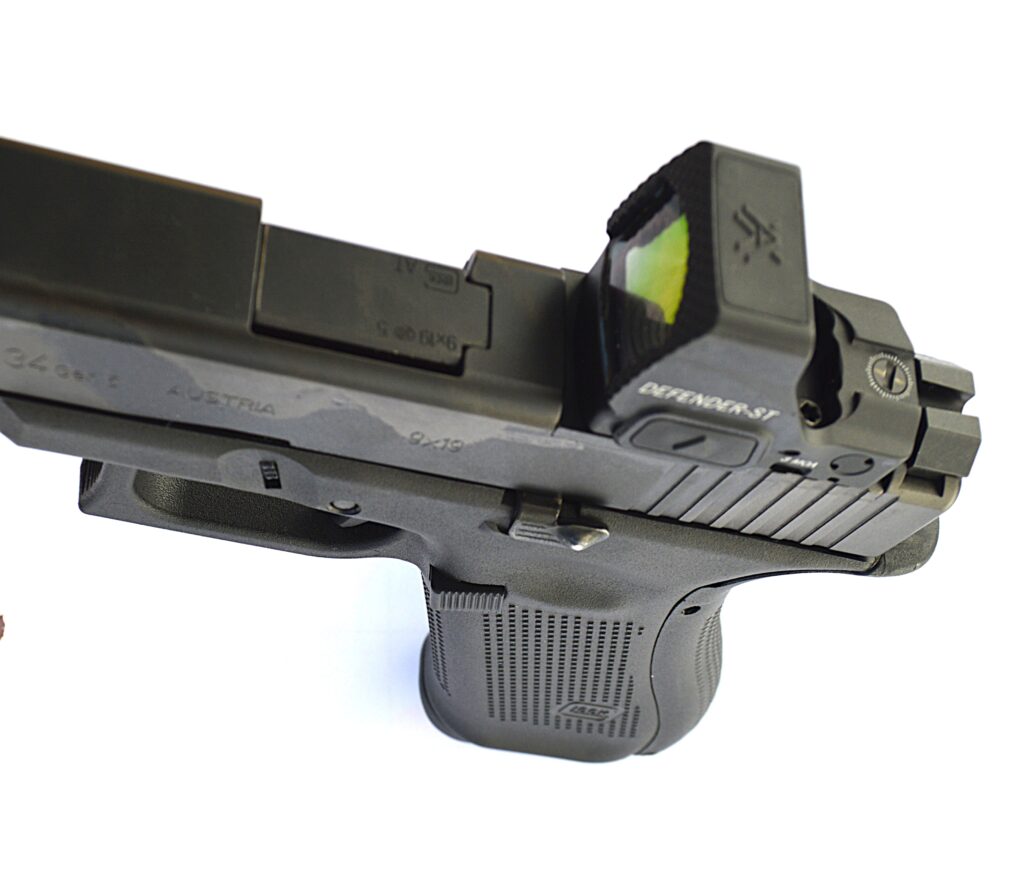 The Defender ST uses the DeltaPoint/DP footprint (Vortex supplies a Glock MOS plate and a Picatinny mount). I mounted it to a Glock 34 using the supplied hardware and tightened the screws alternately for even torque. If you want an even stiffer, proven plate, consider an Athena Precision Glock MOS plate — it’s a premium upgrade favored by many law-enforcement builds.