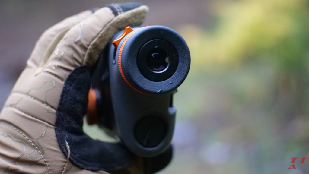 The lighter grey parts of the rangefinder body are lightly rubberized and have an eggshell-like texture, providing a level of grip texture, especially in gloved or wet hands. The darker portions of the body are a hard plastic which is slippery when wet, but given that the rangefinder is small enough to fit in most people’s hands easily, this isn’t a huge issue.
